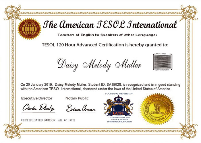 《TESOL资格证书》持有者,可以在世界大多数国家从事英语作为第二外语的教学(ESL,English as a Second Language),其国际认可度很大,可以作为国际公认的“TESOL国际英语教师”资格证书和英语教学行业职业资格的权威国际证明。
