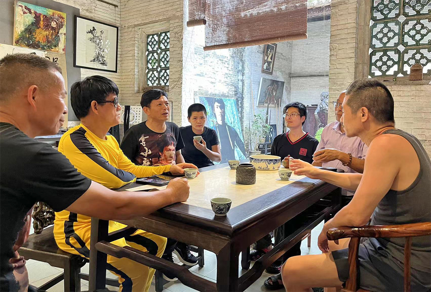 咏春堂现任馆长梁湛声先生和臻武堂馆长墨一刀先生热情接待了他们的造访。阮奇山咏春堂成立于2005年,现任馆长梁湛声为佛山市非遗项目——咏春拳的代表性传承人之一。2017年,阮奇山咏春堂被评为“广东省十佳咏春拳传承单位”。臻武堂馆长墨一刀则堪称武术大家,他当过兵,学过太极、擒拿格斗、咏春拳和截拳道等。梁湛声馆长和墨一刀馆长与欧文等一行座谈交流,在了解了建书院的计划和构想后,认为在阳朔建这样的主题文化书院是一举多得的好事,还介绍了他们自己的心得,提出了不少有创意的建议。